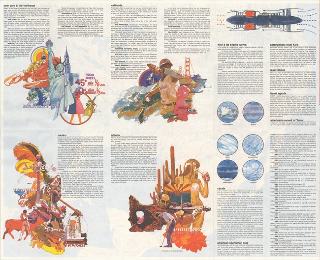A. American Airlines Directions, circa 1969 (27.5 x 20.9"). The map of the United States, Mexico, and part of Canada highlights national parks and forests, Indian reservations, wild life refuges, and more. The verso includes stunning illustrations by Doug Johnson that depict points of interest in New York and the Northeast, California, Mexico, and Arizona in psychedelic Pop Art-style. Promotional text includes information on national parks, notes to the first-time passenger, a primer on how jet engines function, and a timeline of American Airlines' "record of 'firsts'" that goes from 1934 to 1969. Condition: Issued folding with minor wear. (A)