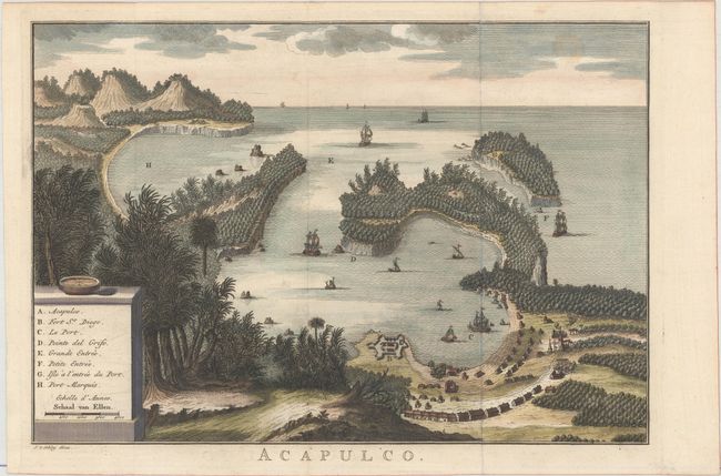This rare bird's-eye view of Acapulco and its bay gives a nice rendering of the town, Fort St. Diego, and the neighboring Puerto Marques Bay. A lettered key identifies each location. Ships fill the harbor, with others at sea as far out as the horizon.