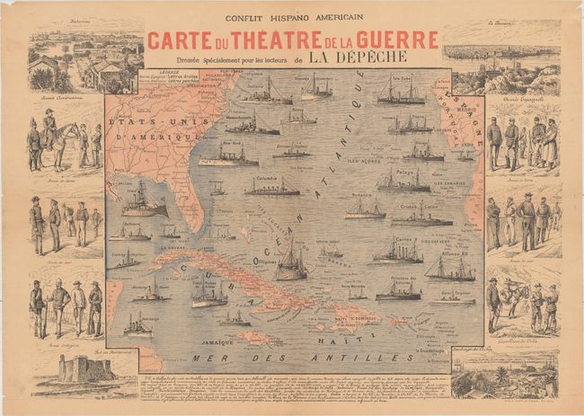 This interesting piece of ephemera was issued as a supplement to La Depeche newspaper, based out of Toulouse in southwestern France near the Spanish border. The map depicts the naval fleets of both Spain and the United States in the North Atlantic Ocean, and is representative of the 10 week-long Spanish-American War which was primarily fought over Cuban independence. The map is surrounded by vignettes depicting the costumes of both American and Spanish military forces as well as views of Havana, Santiago de Cuba and Matanzas. The Americans won the short battle which gave them temporary control of Cuba and possession of Puerto Rico, Guam and the Philippines, thus eliminating Spain's final possessions in the Americas and Asia. Engraved by Charaire.