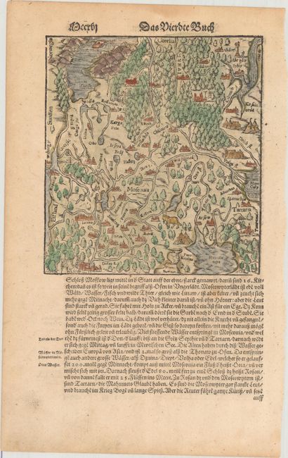 Woodblock map of European Russia, including part of present-day Ukraine. Moscow is prominently featured at center and the map is filled with graphic representation of the rivers, mountains, forests, cities and tent encampments with a bull roaming the countryside. On a sheet of German text measuring 8.3 x 13.1" with engravings of several coats of arms on verso.