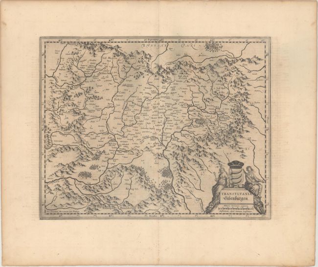 This handsome map of Transylvania shows parts of present-day Hungary and Romania. There is nice detail of forested areas, mountain ranges, rivers, and towns. The elegant title cartouche is flanked with female figures and topped with a crest. German text on verso, published 1638-42.