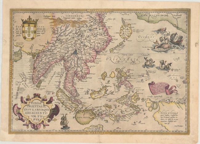 Ortelius' important map of Southeast Asia, based on Mercator's 1569 World map, shows how sketchy the available information was concerning the region. The East Indies are presented as a randomly scattered archipelago with Java and Borneo particularly misshapen. Taiwan is mapped for the first time as I. Fermosa in the 'tail' of kite-shaped Japan's Lequaio islands. The fictitious Chyamai lacus is the source of a network of major rivers in Southeast Asia. Beach pars, a presumed promontory of the great southern continent based on Marco Polo's account, protrudes into the bottom of the map. In the upper right corner, America makes an appearance with the three coastal cities of Quivira, Cicuie, and Tiguex. Near the shore lies a ship being menaced by a pair of sea monsters, while twin mermaids preen before each other near the Ladrone Islands. Spanish text on verso marked page 94.