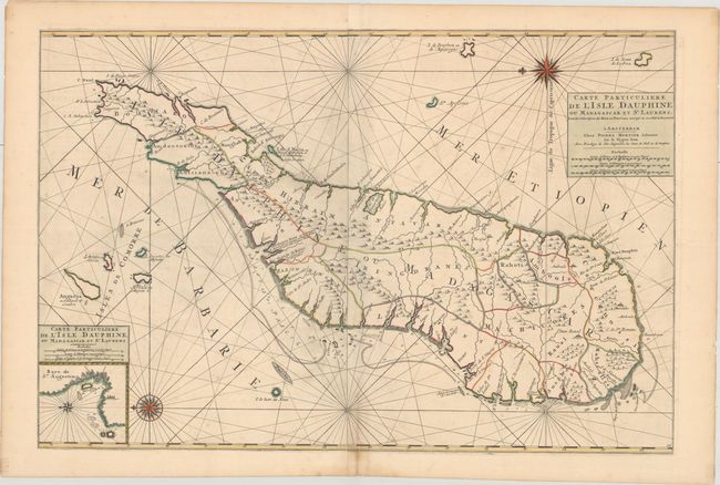 This stunning sea chart depicts Madagascar with its political divisions. Soundings and hazards are shown exclusively along the southern and western coasts. There is nice topographical detail inland, and several place names appear, mostly near the coastline. Fort Dauphin (present-day Tolonaro), the first French settlement on the island, is located. There is an inset at bottom left that zooms in on the Bay of Saint-Augustin. Several smaller islands surrounding Madagascar are identified throughout. North is oriented to the left by two spectacular compass roses. Three distance scales appear in the title cartouche. This chart likely appeared in either Atlas Suite de Neptune Francais or Atlas Nouveau Contenant les Parties du Monde.
