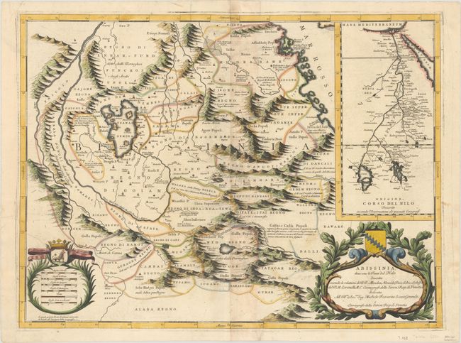 This uncommon map concentrates on the source of the Nile in a lake called Tzana, Dembea (Lake Tana). Coronelli is considered the first mapmaker to accurately depict the source of the Blue Nile. The map is graphically illustrated with large mountain ranges. There are extensive notations throughout. Two large garland-style cartouches feature the title and six distance scales. An inset map at right shows the origins of the Nile on the Ptolemaic model.