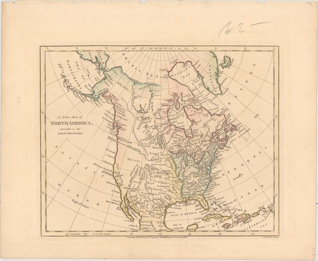 This small map of North America shows the young United States confined to east of the Mississippi River. Florida is divided into East and West Florida, and a prominent River of the West flows into the Pacific. The west coast is labeled New Albion with a few place names along the coast including Sir Francis Drake's Har. 1578. The interior is largely blank with the exception of some limited topography and the river systems including a note that states that the "Missouri Navigable 1300 Miles." Engraved by Thomas Conder.