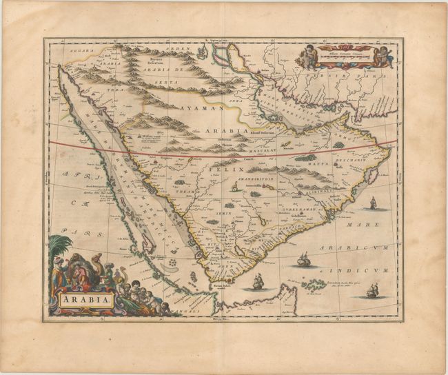 This elegantly engraved and uncommon map divides the Arabian Peninsula into the three regions coined by the Romans: Arabia Petraea, Arabia Deserta, and Arabia Felix. It was published in an era when European knowledge of the region was expanding thanks to increased trade with the Orient. The coastlines are fairly well represented and the interior contains details of the navigable rivers; although this information and the locations of inland towns is largely speculative due to unreliable and often conflicting reports from merchants and explorers. Medina, Mecca, and Aden are among the notable cities identified. Decorative elements include a camel, sailing ships, and an ornate title cartouche featuring camels, putti, and figures in local dress. Tibbetts contends that this is the source for Jansson's similar map of 1658, despite having an apparently later publication date. French text on verso.