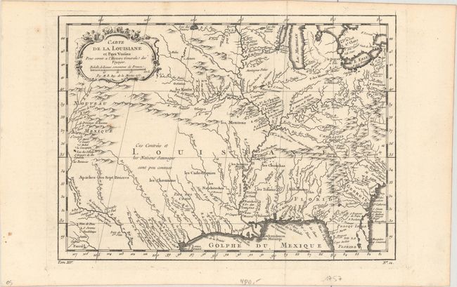 Superb small map based on Delisle's map of the French colony of Louisiana. This finely engraved and detailed map of French Louisiana extends from the Great Lakes to the Gulf of Mexico and from Nouveau Mexique to Florida (not showing the tip of Florida). Many Indian place names, forts, and early European settlements are shown. Nouveau Mexique in the far west includes Santa Fe and names the S. Jerome de Taos. The decorative title cartouche includes the distance scale.