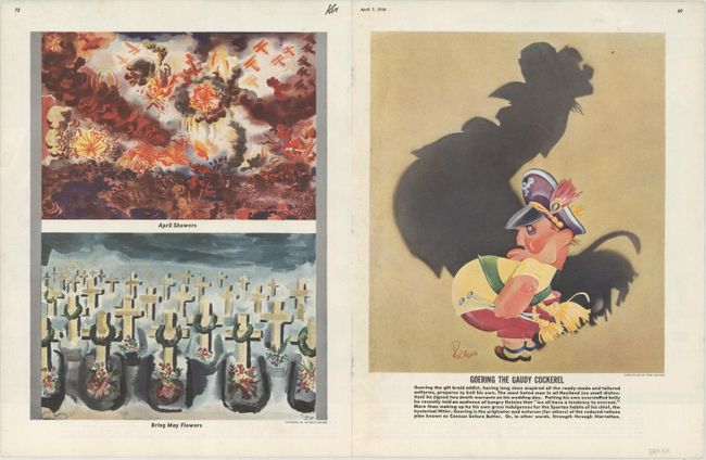 This pictorial map is color-coded to show the extent of the "black plague" across the world. A key at bottom shows three categories of free speech: dictatorial control (black), varying degrees of control (gray), and relative freedom (tan). The map reveals that slightly more than half of the globe is in "Totalitarian Eclipse." Within the map image are ten of these dictators "whose ten totaled brains wouldn't counterbalance that of one Einstein in the measurement of man's distance from the anthropoid ape" including Hitler, Mussolini, Franco, and Stalin (by himself). Drawn by William Cotton and issued in the very first edition of Ken Magazine (April 7, 1938), a controversial anti-fascist magazine. The verso contains a satirical portrait of Hermann Goring, a powerful military figure in the Nazi Party who eventually became Hitler's second in command, and a wartime illustration based upon a painting by George Grosz.