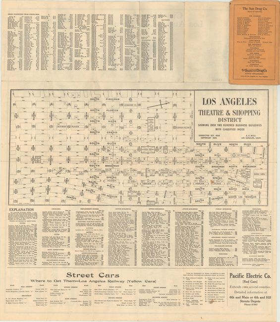 A highly detailed map of Los Angeles created by Laura Whitlock, one of the few female mapmakers in the United States at the time. The map extends from Manchester Avenue north to Hollywood and Highland Park with a street index along the borders. The verso contains the interesting Hill's Map of Los Angeles Theatre and Shopping District... (21 x 9.4") that locates over 200 different buildings with an index by building type. This version of the Hill map has been "Corrected to Oct 1923." Folds into orange paper wrappers (4.0 x 6.7") dated 1924 and offered for sale by The Sun Drug Company. Click here for the similar 1923 edition that was sold in our last auction.