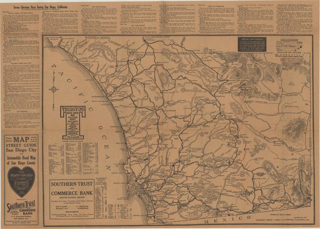 This promotional brochure was issued on behalf of the Southern Trust and Commerce Bank by the Western Map Company. The recto contains a highly detailed map of the San Diego area that extends from Coronado and Point Loma north to Mission Bay and Pacific Beach with an inset of La Jolla at top right. Drawn by D.C. McLain, the map shows electric railways, an "auto scenic trip," post offices, fire stations, schools, and more. The map notes $1.2 million of capital improvements for the U.S. Army Aviation School and $3.0 million for the U.S. Naval Air Station near Coronado. The verso contains a road map for the broader Southern California region with a legend identifying good roads, wagon roads, hotels, gas stations and more. Drawn by George Rock. Self-folding (3.7 x 8.7").
