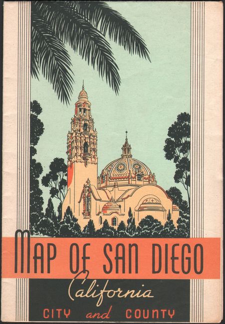 This pamphlet includes a splashy pictorial map, Recreational Map of San Diego... (15.9 x 10.9") as well as a more detailed map showing the street grid pattern of the city. On the larger street map, street car lines and bus routes are noted in green overprinting and a table with 40 points of interest is shown at top. Published by Lowell E. Jones.