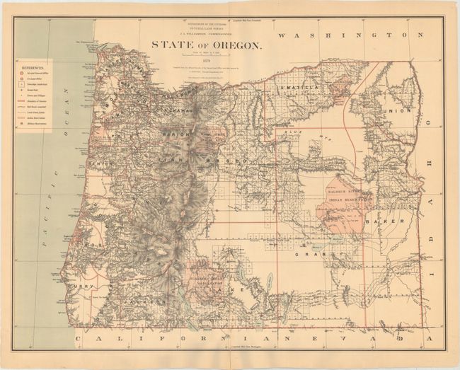 This map was compiled from official records in the GLO and other sources by C. Roeser, Principal Draughtsman, under the direction of J.A. Williamson, Commissioner. Excellent detail from the Cascade Mountains west to the coast notes all towns and villages, roads, and railroads, with watershed and topography shown in bold hachure. The legend identifies Indian reservations, military reservations, railroad limits, land grants, and townships subdivided. The granted and indemnity limits of military wagon roads are illustrated. Lithography and printing by Julius Bien in New York City.