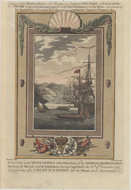 This lovely view shows the capture of St. Lucia by Admiral Samuel Barrington on 30 December 1778. As a result of France's entry into the American Revolutionary War, Britain invaded St. Lucia in order to establish a base to monitor French activity in the area. The view depicts six ships lined up and British troops disembarking to take possession of the island after France's withdrawal. The view is surrounded in a superb frame-style border that gives a 3-D effect. Drawn by William Hamilton and engraved by Thornton. Published in Edward Barnard's The New Comprehensive and Complete History of England.
