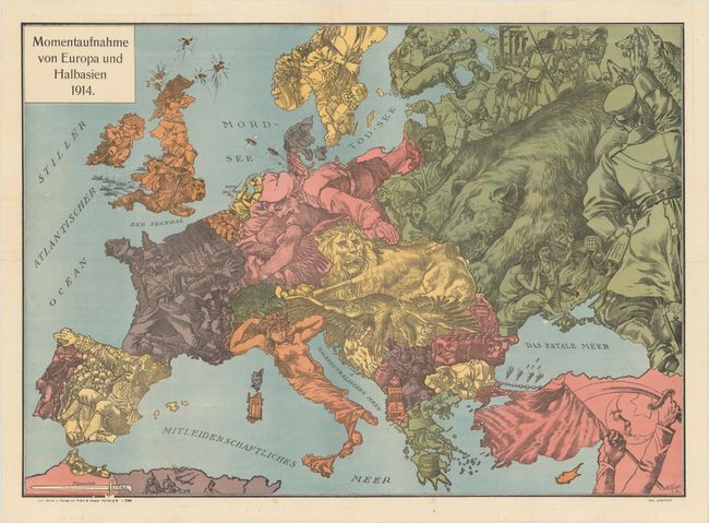 This rare and fascinating political propaganda map was created by Wilhelm Kaspar and gives a German perspective at the beginning of World War I. The key countries involved in the war are represented by human or animal caricatures with various props that help illustrate the situation. Published by Graht & Kaspar.