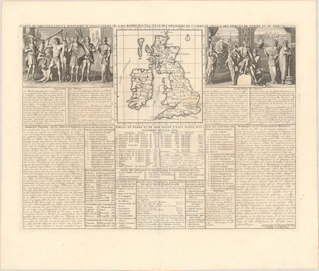 An interesting map of the of British Isles (6 x 6.5") and two allegorical scenes representing British military and government, separated into land forces on the left and naval forces on the right. The French text below expounds on English military strength in 1704.