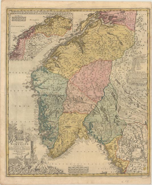 This handsome, detailed map, in two parts, is based on the style popularized by Frederick de Wit. The southern part of the country is the focus of the main map, while the northern part is depicted in a large inset at top. There is amazing detail of the fjords and coastal islands. A key appears at right inside a decorative cartouche. The large, elaborate title cartouche is surrounded by mermaids, cherubs, and the coat of arms.