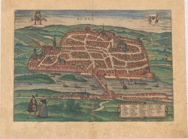 This is an attractive birds-eye view of Blois, France, situated on the Loire river. The city served as the residence of Louis XII and Francis I during the 16th century. At lower right is an index to 43 locations within the city. Latin text on verso.