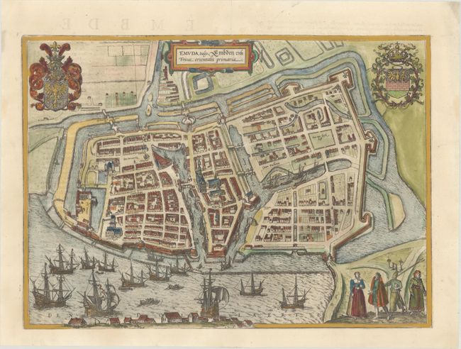 This handsome bird's-eye plan shows the town of Emden in northwestern Germany on Dollart Bay at the mouth of the river Ems. An important port city in the mid-sixteenth century, Emden has canals within its city limits, which enabled the city to extend its harbor in 1536 to accommodate more ships. At the center of the view is the large town hall, with the famous Gothic Grosse Kirche along the harbor at left. The Grosse Kirche was an important centre for the Protestant Reformation, and was unfortunately destroyed in World War II. The view is embellished with local figures at bottom right, numerous ships, and the coats of arms of Germany and Emden. French text on verso.