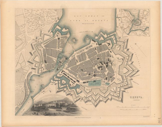 Terrific plan of the fortified city with great detail of major buildings, streets, fortifications, bridges and the surrounding area. Includes an inset "Environs of Geneva" and a vignette showing the city from across the river with individual buildings clearly visible and numerous figures in the foreground.