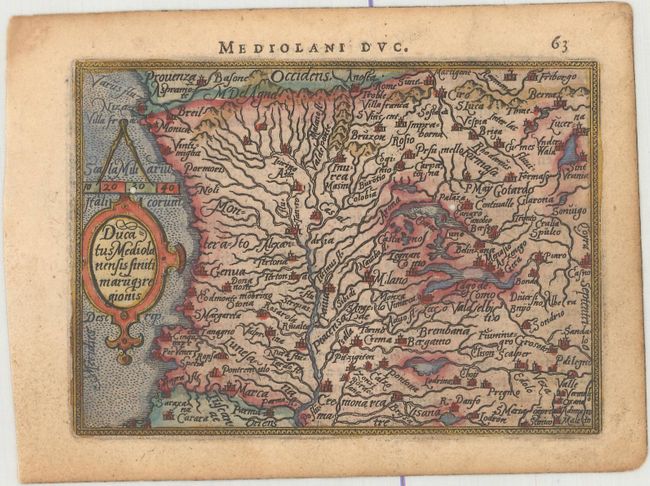 Miniature map of northern Italy oriented with north to the right and decorated with a strapwork title cartouche. The map is centered roughly on Milan and Lake Como and shows the Po River system quite well. French text on verso. The first pocket version of Ortelius' Theatrum was published by Philippe Galle in 1577 as Spieghel der Werelt. Galle began a new edition with new plates, commonly known as the Epitome, in 1588. Galle's miniature atlas was quite popular, and was published in editions until 1602. From 1583 he gradually introduced a new set of maps, both adding to and replacing the originals. The plates were then passed to Jan B. Vrients, who retouched some of the plates and published the final editions of the Epitome in 1601 and 1602.