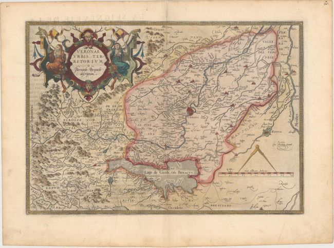 Handsome and beautifully composed map of the vicinity of Verona, from Mantua to Trento, with Lake Garda shown prominently. The map is based on the cartography of Bernardino Brugnoli. A large, exotic title cartouche fills the upper left corner. French text on verso, published in 1581.