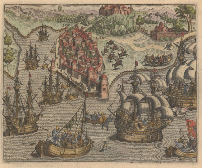 This engraving depicts Hans Staden's ship landing at "Cape de Gel" (Asilah) and capturing a cargo ship. The crew of the cargo ship escape in small boats, and Staden and his men take the supplies from the ship.