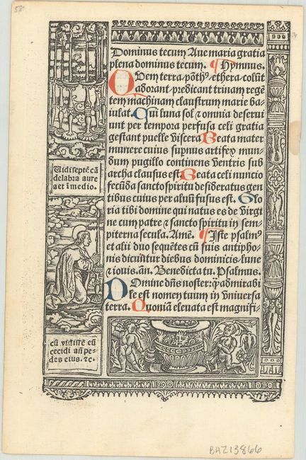 Unusual vellum leaf printed in Gothic textura type with illuminated capitals in red and blue. The text is surrounded by elaborate iron engravings that include plants and animals, including birds, rabbits, a horse and a bat. These leaves are from the transitional period when the new technology of printing with movable type was combined with the more labor intensive methods of hand painting. Printed vellum Book of Hours leaves are very scarce, as they were only produced between 1496 and 1530. This leaf includes on recto a vignette from the Book of Revelation in which John encounters a seven-headed beast.