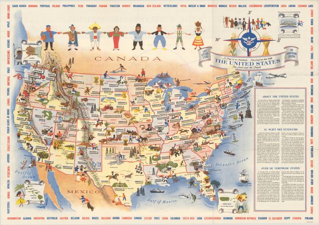 This very decorative pictorial map of the United States was designed by commercial artist Mary Ronin and published to promote the Brussels Universal and International Exhibition of 1958 (or Expo 58). It is a celebration of the diversity of cultures found in the United States, with common background nationalities noted in each state (for instance: Greek, Spanish, and Cuban in Florida; Finnish, Dutch, Belgian, Rumanian, and Syrian in Michigan). The map is filled with small illustrations highlighting history and culture: one of Christopher Columbus' ships sails across the Atlantic; the Statue of Liberty looms over a traffic cop and a rabbi off the coast of New York; a jazz trio plays on the Tennessee-Alabama state line; a cowboy lassoes a steer just above the Alamo in Texas; a film cameraman shoots the Pacific just to the north of an 18th-century Franciscan missionary in southern California. Four small insets in the corners show Alaska, Hawaii, Puerto Rico, and the United States Pavilion at the Expo. Figures representing different ethnicities and backgrounds hold hands above the map. The border is made up of alternating red and blue text listing the various nations of the world. Includes text and alternative titles in French and German. Verso features a diagram of, and guide to, the United States Pavilion.