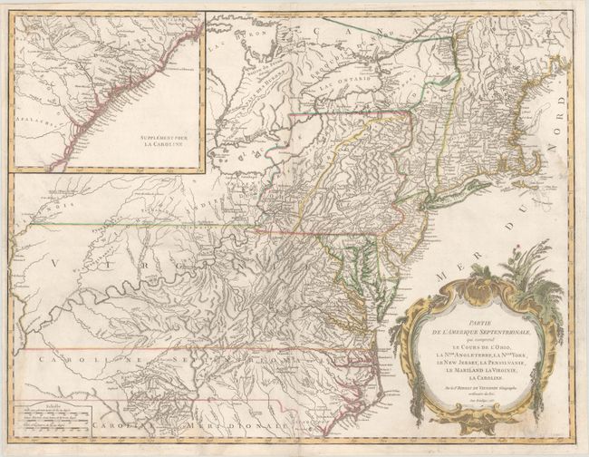 Beautifully engraved large map of the colonies between the Ohio and Mississippi rivers and the Atlantic with an inset at upper left that continues the main map from Cape Fear south through the Carolinas and Georgia to F. St. Georges. It is based on the seminal map by John Mitchell, published in 1755, the same year this plate was initially engraved. The mapping of the trans-Allegheny and Great Lakes regions and in the interior of New England is of particular interest, for this shows some of the earliest accurate information of these regions incorporating data from the Mitchell, Evans, and Fry-Jefferson maps. Also of great interest is the region known as the Forks of the Ohio (confluence of the Allegheny and Monomgahela rivers) and the location of French Fort Duquesne – the region hotly disputed during the French and Indian War. This is an unrecorded state in between the first and second, retaining the final line below the title ("Avec Privilege 1755") but adding several changes present on the second state, such as the 1763 Treaty of Paris boundary shown as a dotted line. Pennsylvania extends to take in most of present-day New York, and in New England New-Hamp-Shire and Prov. De Sagadahock have been added. It is embellished with a large title cartouche engraved by Marie Catherine Haussard.