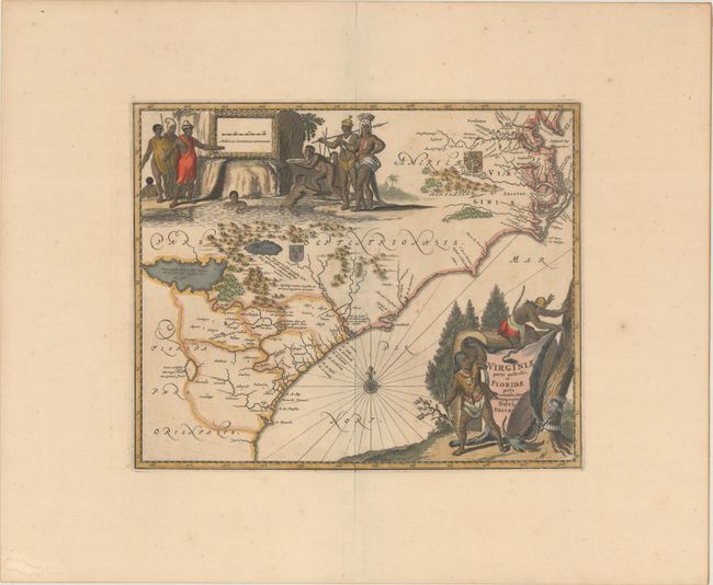This striking map of the Southeast shows the French and English claims in the region marked with their respective coats of arms. The cartography in the southern part of the map retains Le Moyne's three imaginary lakes, the largest draining through the Carolinas via the May River. While the map is nearly identical to the Blaeu/Jansson model on which it is based, the decorations are entirely original. The title cartouche is engraved onto a buffalo hide displayed by two Native Americans and at top is a large view that illustrates a group of natives panning for gold.
