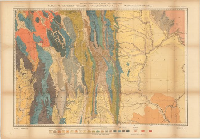 This complete set contains nine maps and one panoramic view, while the front cover pastedown lists only 6 maps and 1 panorama. The 3 additional maps are numbered 8, 9 and 10 in the upper right corner, as are the first 7, which suggests the paper label is inaccurate and that all of the maps were intended to be issued in this fashion. Seven of the maps have brilliant lithographed color showing the geology of the region, including Yellowstone and parts of Wyoming, Idaho and Utah. All fold into original hardbound covers with gilt titling.