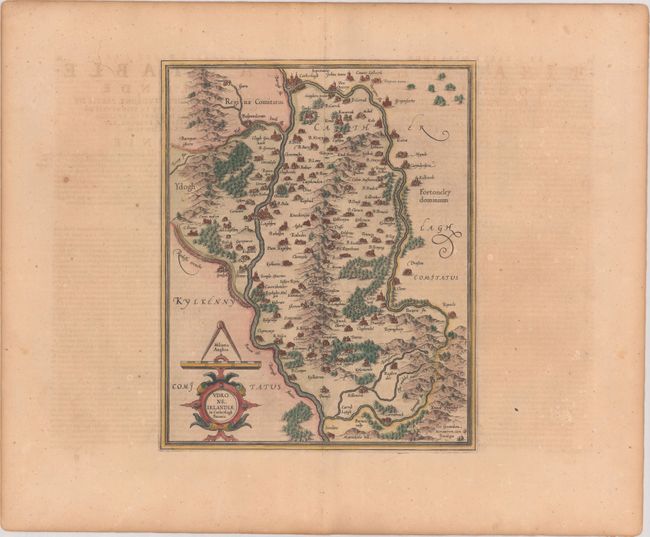 A fine map of Udrone - present-day County Carlow in Leinster province. The map is richly engraved to show the mountains, rivers, forests, villages and the two major cities of Catherlagh (Carlow) and Laghlyn (Leighlin Bridge). The strapwork title cartouche incorporates a distance scale. French text on verso.