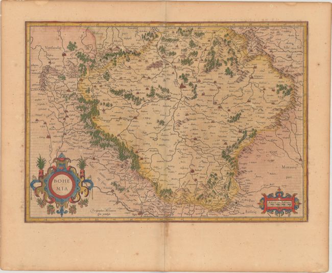 This fine map of Bohemia is centered on Prague. It is boldly engraved in Mercator's style with mountains, forests and hundreds of tiny villages. Two strapwork cartouches at bottom hold the title and distance scale. French text on verso.