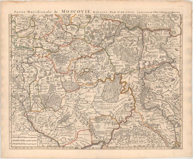 Matched pair of the northern and southern sheets of Delisle's important map of the Russian Empire. Both sheets provide great detail of the towns, roads, forests and topography. The northern map is decorated with a nice title cartouche featuring a sleigh, coat of arms, animals and a hunter. The southern sheet includes Moscow and features three distance scales. Size given is approximate for each sheet. A very attractive example of this map in its original unjoined state. If joined the map would measure approximately 24.3 x 39".