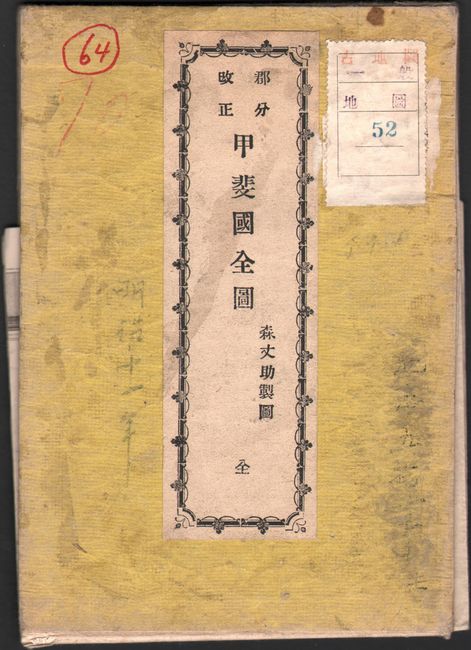 This map by Josuke Mori shows the historical Kai province that is now known as the Yamanashi Prefecture. The map is oriented with north to the upper left and gives great detail of topography shown by hachures, including the impressive Mount Fuji. Also depicted are cities, roads, and rivers in the region. The corners of the sheet feature four hemisphere maps of the North Pole, the Eastern Hemisphere, the Western Hemisphere, and the South Pole. An additional inset includes a bird's-eye plan of Kofu. Issued folding into attached paper wrappers with a printed title label.