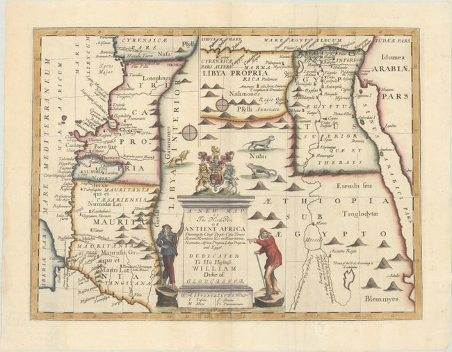 A most unusual and interesting map with an odd orientation. The northern coastline is shown top to bottom on the left side of the map, with the coast of Egypt and two potential courses of the Nile shown on the right side with north oriented to the top. Dividing the two maps is the very large title cartouche, with two odd-looking figures, the coat of arms of the Duke of Gloucester, and lion, a cheetah and a large lizard.
