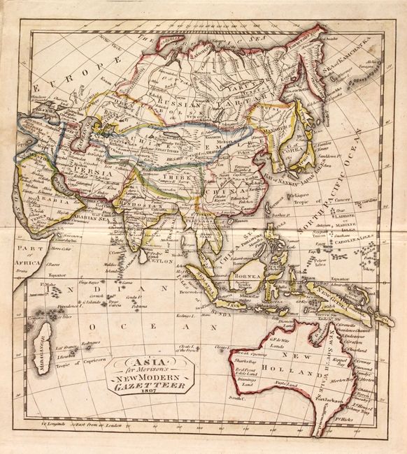 This scarce pocket atlas was produced by James Morison in Perth, Scotland. It contains 24 (of 25) double-page and folding maps, missing only the map of South America. The maps are dated 1806-1809 with about half of the maps engraved by either Daniel Lizars or Thomas Clerk. The maps were originally issued in other publications, with most maps including either "New Preceptor" or "New Modern Gazetteer" in the title. The atlas includes maps of the world, Europe, Asia, Africa, and North America, along with 12 regional maps of Europe, East and West Indies, India, and 4 maps of the ancient world. Of particular interest is the map of North America, which shows the United States extending to beyond the Missouri River with an oddly shaped stovepipe Louisiana to its west. The Pacific Northwest is marked "Unexplored Country" and is part of New Mexico. Both the world and Asia map show Tasmania still connected to Australia. Includes two additional plates of the solar system and an armillary sphere at the rear of the volume. Hardbound, quarter leather over paper boards.