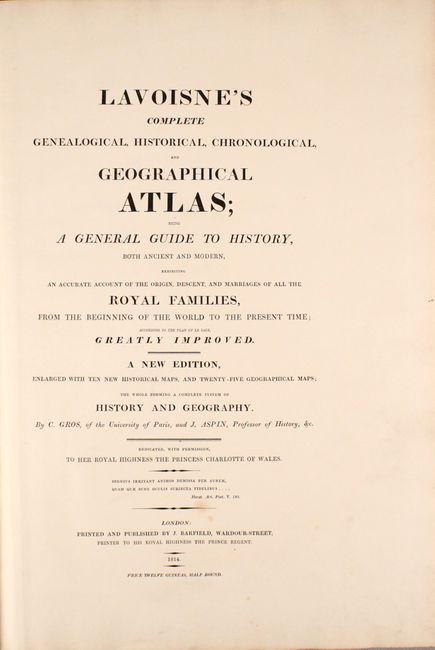 This is Lavoisne's third American edition folio atlas "carefully revised and corrected" by C. Gros and J. Aspin. Published by M. Carey and Sons, and printed by T.H. Palmer "on Ramage's Ruthven Press, and on J. & T. Gilpin's Machine Paper." The atlas is complete and contains 20 double-page and 10 single-page maps, plus scores of detailed and colorful tables, chronological and historical. The maps are listed below.