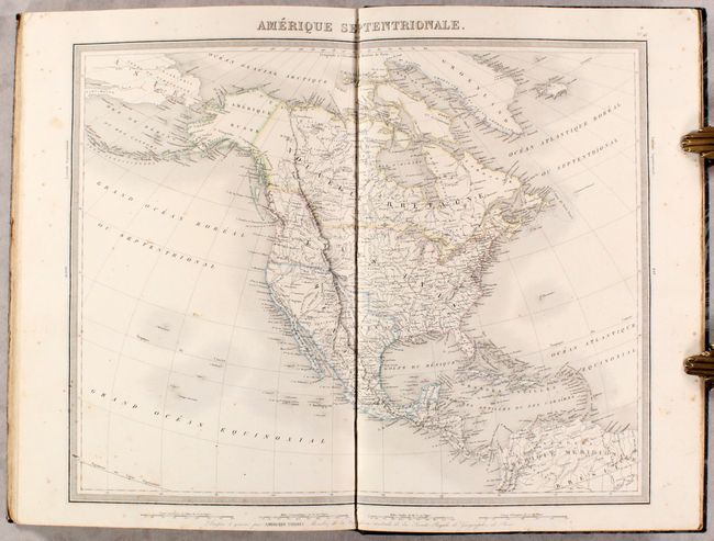 This nearly complete atlas (26 of 27 maps) consists of 7 ancient maps and 19 (of 20) modern maps. The missing map is Environs of Paris. Modern maps include the world, Europe, Asia, Africa, North America, South America, Australia, 11 regional maps of Europe, and a map of northwestern Africa. Of particular interest is the map of Amerique Septentrionale showing evolving political configurations. In the west, the boundary between the United States and Canada extends well into British Columbia, reflecting U.S. interests in the region. Mexico is still in control of the southwest, and Texas is a part of Mexico despite the publishing date. The maps are surrounded by a keyboard-style border with large block titles above the maps. Published by Malte-Brun. Hardbound in quarter leather over marbled boards with gilt tile on spine.