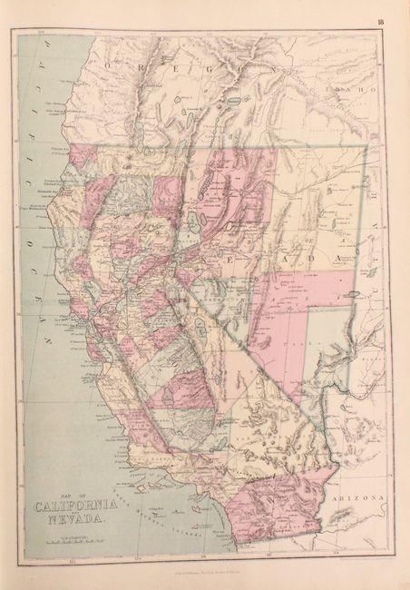 Map of California and Nevada. This map captures the rapid development taking place throughout California. Includes terrific detail of counties, towns, topography, rivers, railroads, and more. California has 37 counties with a huge San Bernardino County dominating the south. Railroads extend south to Monterey. Nevada shows early development in the Reno/Carson City corridor and only eleven counties are depicted.