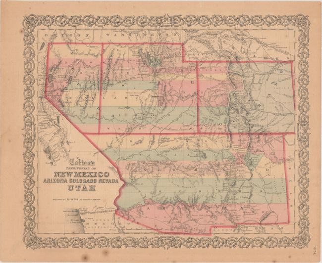 B. Colton's Territories of New Mexico Arizona Colorado Nevada and Utah. This is a rare issue of Colton's great map of the American Southwest featuring the territories shown in transitional states. The proposed territory of Arizona is shown to the south of New Mexico, with New Mexico extending from Texas to California. The newly proposed territory of Nevada is shown taking in the western part of Utah with the border at the 116th meridian, and extending south only until the 37th parallel. The territory of Colorado appears at right. The map locates numerous early exploration routes, mail routes and proposed routes for the Pacific Railroad. Surrounded by Colton's distinctive scroll border. Dated 1855, this was published circa 1860. Condition: Light toning and a few spots of foxing.