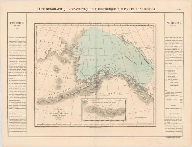 This map is similar to those issued in Carey and Lea's American Atlas but is unique to Buchon's French publication. It presents a largely undeveloped Amerique Russe with 8 undefined provinces noted along the coastline. The map spans from Haida Gwaii (formerly the Queen Charlotte Islands) through the Aleutian Islands and incorporates the discoveries of Vancouver and La Perouse. A small inset depicts the far western reaches of the chain. On a full folio sheet (27.0 x 20.9") with French text flanking the map that describes the region, climate, and population. The capital is listed as Sitka, consisting of 60 houses and 1,000 people. Buchon issued his maps on finer paper and they are usually found in much finer condition than his American counterparts.