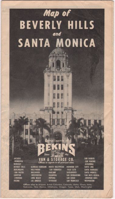 A detailed map of western Los Angeles County published by Bekins Van and Storage. It extends from Venice and Santa Monica east to Baldwin Hills and West Hollywood showing the street-grid pattern, UCLA, Los Angeles Country Club, Hughes Aircraft Company, and the location of three Bekins storage facilities. Decorated by a compose rose with the company's name at center. The verso contains related text, advertisements, and a detailed street index. Self-folding (5.0 x 8.9").