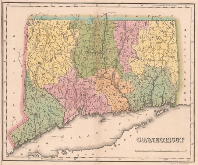 This map was finely engraved by Young & Delleker. It shows the state with a population of only 275,000 as compared to today's number of nearly 3.6 million. Eight counties are named and there is a good network of wagon roads. Norwalk, Fairfield, New Haven, New London, Fort Trumbull and Mystic are marked with flags to indicate "places remarkable for battles, sieges, &c." The map is on a full folio sheet (21.9 x 17.7") and flanked with English text giving a brief description of the state’s boundaries, productions, rivers, climate, chief towns, commerce, education, and religion.