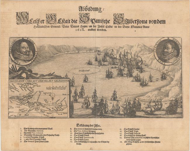 This scarce engraving of the Dutch and Spanish fleets in Patanca Bay, Cuba illustrates the events in 1628 when the Dutch buccaneer Pieter Hayn captured the Spanish silver fleet. Medallion portraits of General Pieter Hayn and Admiral Cornelius Long fill the top corners. At bottom left is a map of Cuba and Jamaica with north oriented to the bottom. A numbered key identifies the fleets and 20 ships with their captains. The view was based on an engraving by Casper En, which was published by Hulsius in 1629.