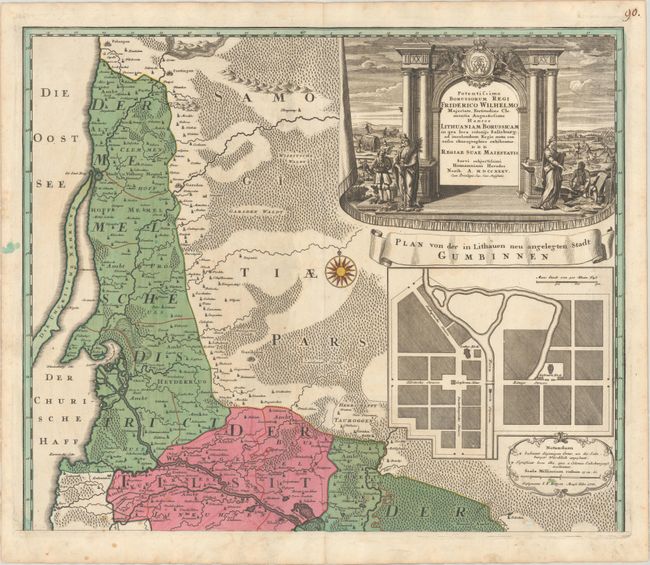 This large and handsome map covers the area of Lithuania Minor or Prussian Lithuania, spanning from Palanga in present-day Lithuania down to Goldap, Poland. It was published in the aftermath of the Great Northern War plague, which devastated this region. There is fine detail throughout, with towns and cities, political divisions, rivers, lakes, forests, and other topographical features shown. The eastern part of Kaliningrad Oblast appears, and the town of Gusev (here called by its German name, Gumbinnen) is depicted in plan form in an inset beneath the title cartouche. Around the time of the map's publication, Frederick William I of Prussia was rebuilding and repopulating the plague-stricken Gusev with Protestants who had been pushed out of the Archbishopric of Salzburg. The extremely decorative title cartouche at top right presents a scene of reconstruction and abundance.