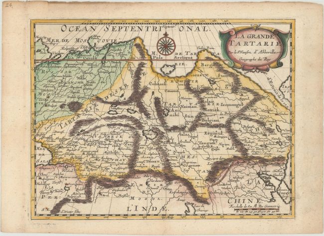 Attractive map of Siberia, northern China, and Korea, which is shown here as an island. The cities, mountains, forests and rivers are well-detailed. Siberia still reflects some of Ptolemy’s conceptions with the Island of Tazata and the Cape of Tabin in the extreme north. The map is decorated with a lovely title cartouche as well as a beautiful compass rose. Engraved by Antoine d'Winter.