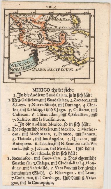 B. Mexico sive Nova Hispani. This tiny map depicts the region of present-day Mexico and Central America, extending from Sinaloa south to Panama. The region to the north of the Las Palmas River is labeled Florida with New Mexico to its west. The Florida peninsula takes an odd shape and is labeled Tegeste. This is the second state with VIII.c above the top border. Condition: A dark impression on a clean sheet. (A)