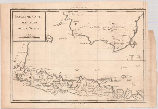 B. Deuxieme Carte des Isles de la Sonde, (13.5 x 9.3"). This handsome map of the island of Java extends to show the southern parts of Borneo and Sumatra. Detail is primarily confined to Java. A notation (in French) in the interior of Borneo states that the region is occupied by a nation of savages. At top right, outside neatline, is "Tom. 15. Pag. 401."