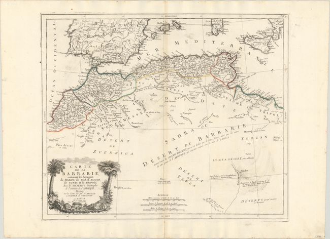 This is the classically detailed and hard-to-find Italian edition of de Vaugondy's map of North Africa. The map covers the region from the Sahara to the southern reaches of Portugal, Spain, and Italy. There are plenty of place names and excellent detail of coastal features. The interior is left mostly blank except for several comments in French. It features a decorative title cartouche with a lion and female figure reclining beneath palm trees and three distance scales.